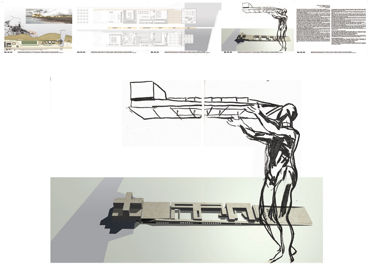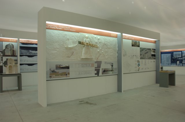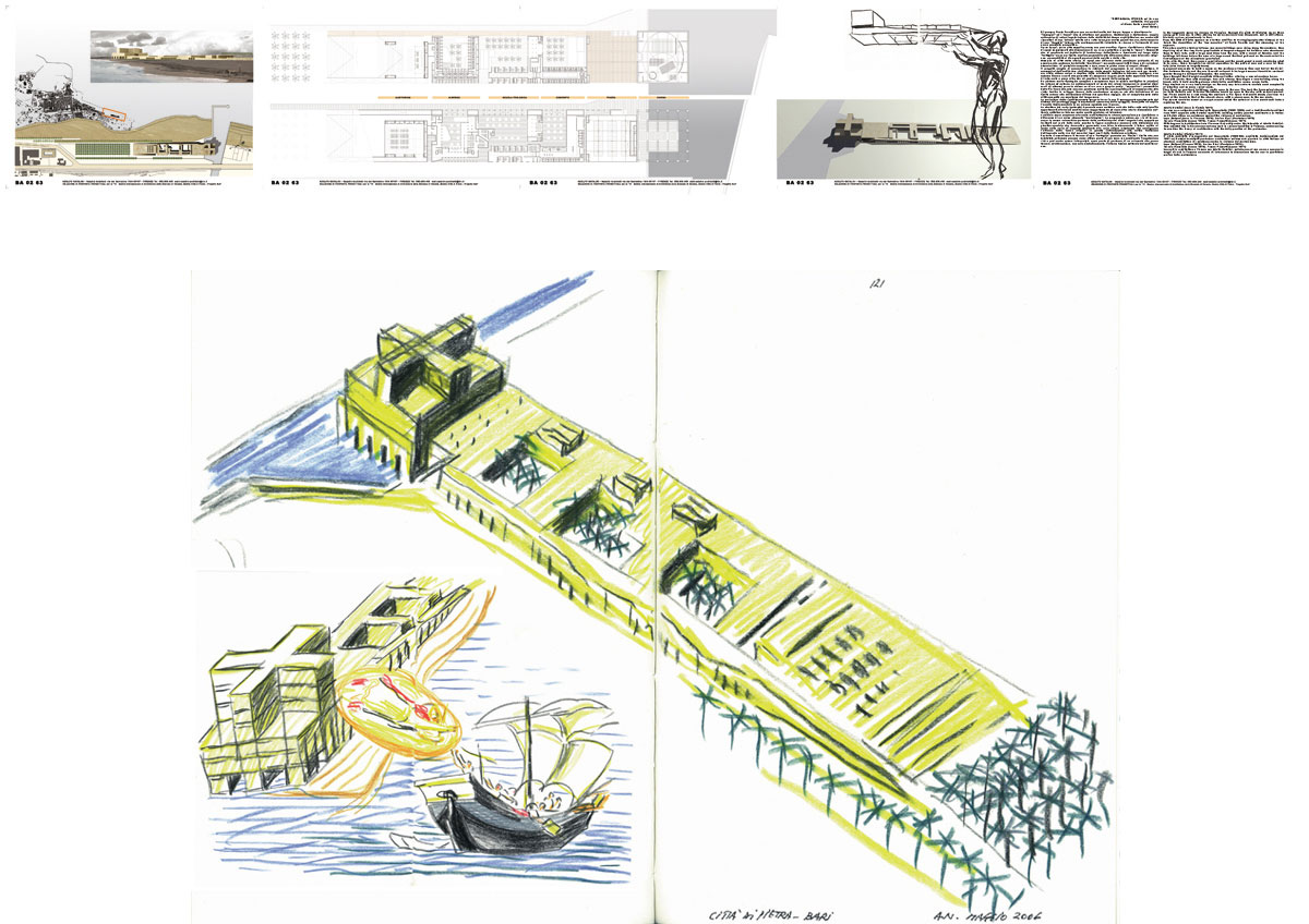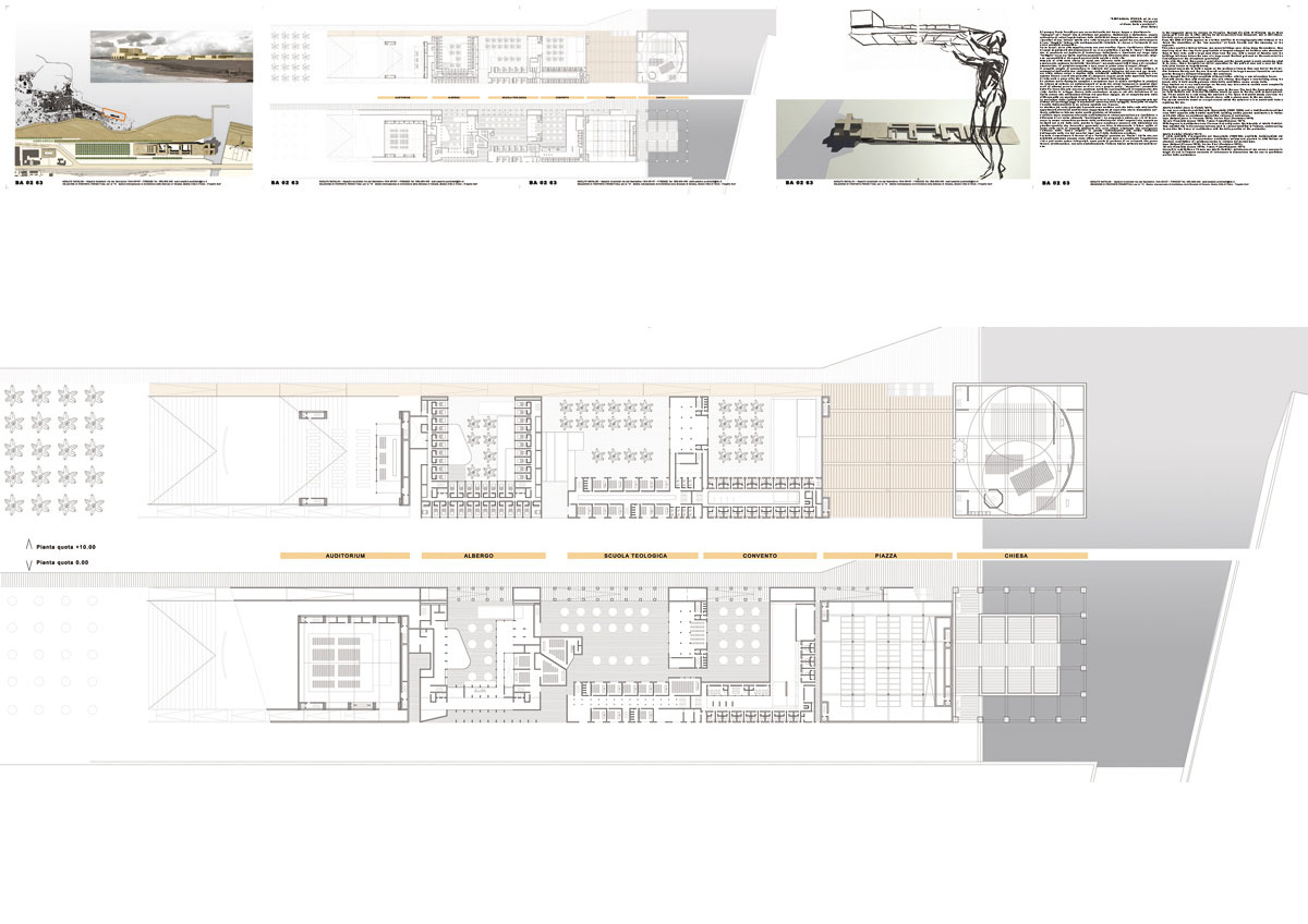 Ri-pensare Punta Perotti provoca un cortocircuito del tempo, troppe e simultanee le “immagini” ed i “suoni” che si affollano nel pensiero. Costruzione e distruzione, coppia antinomica di azioni legate insieme dalla ciclicità del tempo architettonico, ma anche atti risarcitori di una “offesa” subita ed a volte forse provocata; quindi trovare, dalle macerie di una “tragedia” interna alla contemporaneità violentata, le risorse e l’orizzonte di una nuova possibile prospettiva. Forse da qui, da un atto semplice nasce una nuova-antica figura, ripetizione e differenza di spazi commisurati alla dimensione di un vivere collettivo e pertanto “sacro”. Comunità che si manifesta nel desiderio di fondazione, delimitando e tracciando sul luogo della “battaglia” un nuovo limite, confine permeabile alle differenze siano esse laico che religiose, permeabilità ai divergenti percorsi dello spirito e della vita. Memorie di città della storia, di spazi che affiorano dalla coscienza profonda di un pensiero che qualcuno ha definito “meridiano”, ma anche spazi fatti di luce e di variazioni atmosferiche, di materiale compatto e duro come la pietra come di acquei riflessi. Il progetto sceglie di concentrare le richieste del programma in un unico sistema. Il susseguirsi dell’auditorium, dell’albergo, della scuola teologica, del convento per terminare nella chiesa unica e duplice della cristianità cattolico-ortodossa, configura uno schema lineare a corti che permette di recuperare la gran parte della superficie dell’area di intervento a parco oltre che ad ampliare lo spazio della spiaggia. Un sistema morfo-tipologico semplice e complesso dove la misura moltiplica le relazioni tra interno ed esterno. Lo schiacciamento al suolo dei volumi (compresi in massimi nove metri di altezza) pone la chiesa su di un vero e proprio podio “acropolico”, accessibile dalla Via Sacra che sale con una pendenza molto lieve percepibile più al cammino che alla vista. Inoltre lo sviluppo lineare della costruzione concorre, sia alla definizione di un limite urbano alla edificazione-diffusa del quartiere Japigia, sia al completamento della città compatta novecentesca del Lungomare.