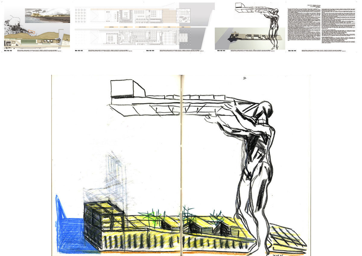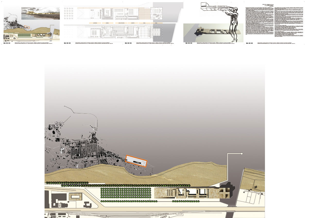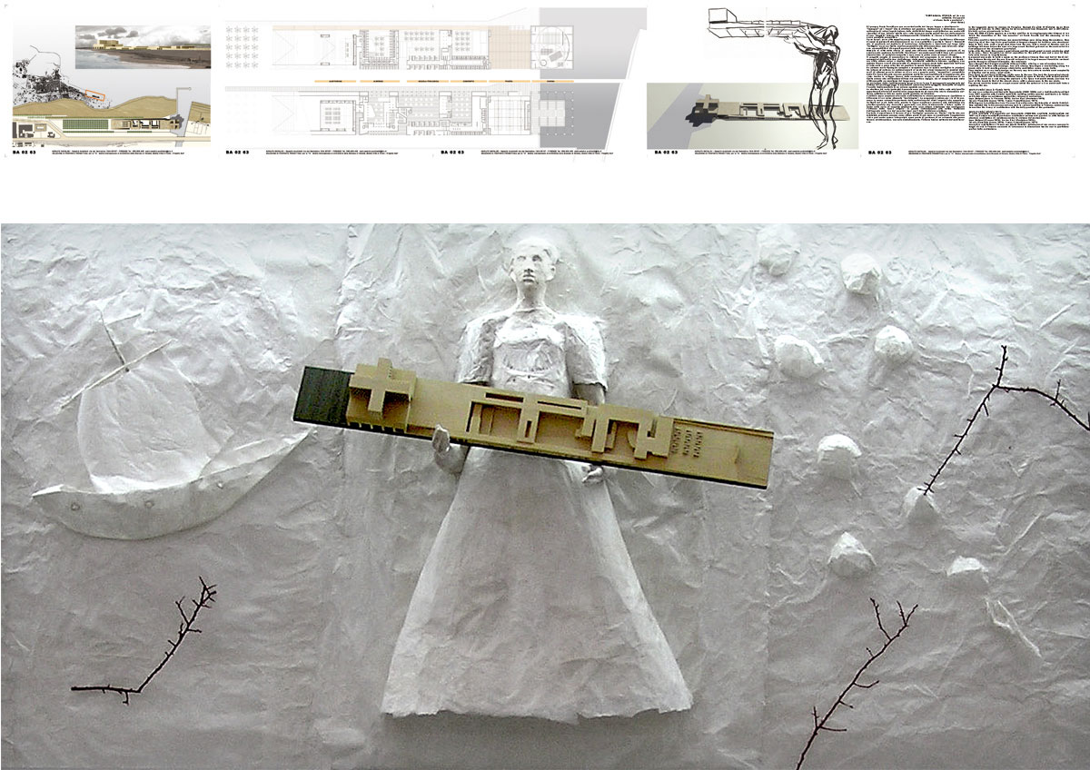 Ri-pensare Punta Perotti provoca un cortocircuito del tempo, troppe e simultanee le “immagini” ed i “suoni” che si affollano nel pensiero. Costruzione e distruzione, coppia antinomica di azioni legate insieme dalla ciclicità del tempo architettonico, ma anche atti risarcitori di una “offesa” subita ed a volte forse provocata; quindi trovare, dalle macerie di una “tragedia” interna alla contemporaneità violentata, le risorse e l’orizzonte di una nuova possibile prospettiva. Forse da qui, da un atto semplice nasce una nuova-antica figura, ripetizione e differenza di spazi commisurati alla dimensione di un vivere collettivo e pertanto “sacro”. Comunità che si manifesta nel desiderio di fondazione, delimitando e tracciando sul luogo della “battaglia” un nuovo limite, confine permeabile alle differenze siano esse laico che religiose, permeabilità ai divergenti percorsi dello spirito e della vita. Memorie di città della storia, di spazi che affiorano dalla coscienza profonda di un pensiero che qualcuno ha definito “meridiano”, ma anche spazi fatti di luce e di variazioni atmosferiche, di materiale compatto e duro come la pietra come di acquei riflessi. Il progetto sceglie di concentrare le richieste del programma in un unico sistema. Il susseguirsi dell’auditorium, dell’albergo, della scuola teologica, del convento per terminare nella chiesa unica e duplice della cristianità cattolico-ortodossa, configura uno schema lineare a corti che permette di recuperare la gran parte della superficie dell’area di intervento a parco oltre che ad ampliare lo spazio della spiaggia. Un sistema morfo-tipologico semplice e complesso dove la misura moltiplica le relazioni tra interno ed esterno. Lo schiacciamento al suolo dei volumi (compresi in massimi nove metri di altezza) pone la chiesa su di un vero e proprio podio “acropolico”, accessibile dalla Via Sacra che sale con una pendenza molto lieve percepibile più al cammino che alla vista. Inoltre lo sviluppo lineare della costruzione concorre, sia alla definizione di un limite urbano alla edificazione-diffusa del quartiere Japigia, sia al completamento della città compatta novecentesca del Lungomare.