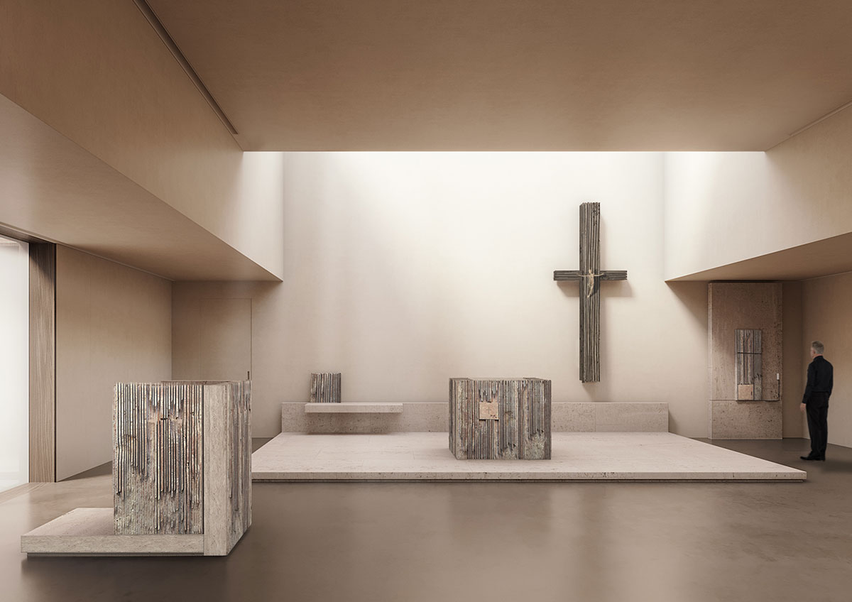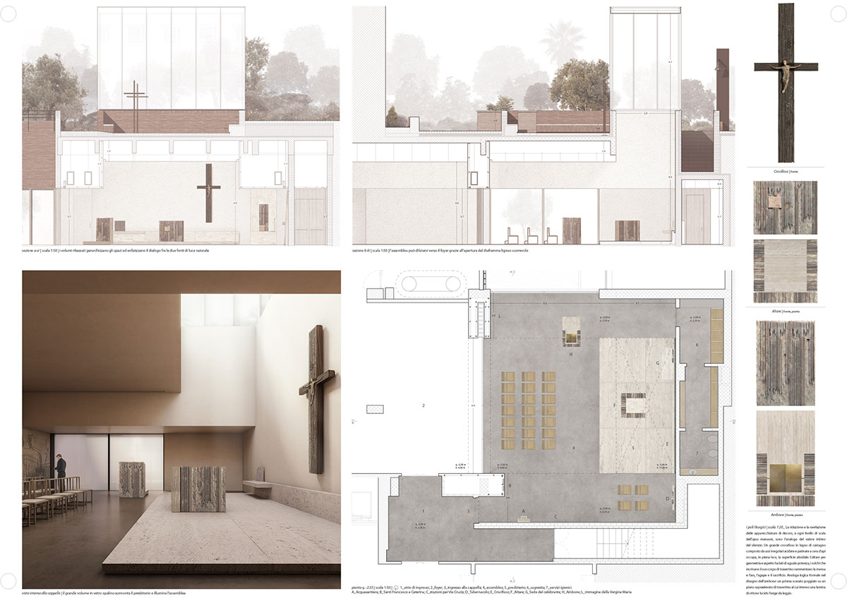 La Cappella, attraverso la modulazione delle altezze dei soffitti, è organizzata secondo due navi laterali e uno spazio centrale ma è la luce naturale lo strumento che la orienta, la ordina, la vivifica. Al mattino dal prisma di cristallo colerà una luce calda e soffusa che bagnerà il crocifisso sul muro absidale allargandosi sull’altare e sull’intero presbiterio; al crepuscolo il prisma diverrà una lanterna, ben scorgibile nella vasta corte del complesso. Una seconda fonte di luce è stata ottenuta inserendo una lunga finestra sul fianco a meridione in modo da irraggiare il lato dell’evangelo su cui insiste il monumento dell’ambone. Il ridotto repertorio di forme e materie presenti nella costruzione e nel suo ornamento enfatizza, per contrasto, la ricchezza delle molte lingue che articolano la «preghiera corale della Chiesa»: musica, gestualità, odore, tatto, percezione, parola.