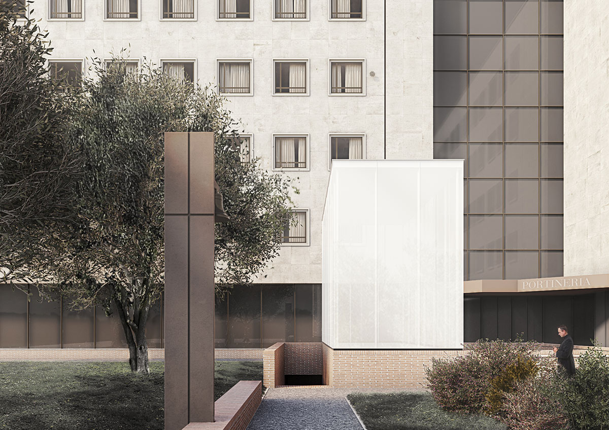 Il progetto origina dalle condizioni e dalle contingenze date: le scelte fondanti sono state compiute immaginando di portare a compimento alcuni caratteri, alcuni tratti latenti nel manufatto esistente. Da qui discende la volontà di stabilire una connessione tra sotto e sopra, tra ambiente ipogeo e suolo, tra spazio santo e spazio feriale. Il volume regolare di un parallelepipedo in vetro opalino emerge dal piano di campagna come proiezione dell’area presbiteriale, costituendosi come la quinta di un nuovo giardino il cui perimetro ricalca la sala di preghiera sottostante. Il giardino, cinto da un basso muro che alloggia una panca, è segnato da una esile croce e si offre come luogo per la preghiera e l’incontro; per morfologia e posizione dialoga con il vicino patio ribassato, l’ingresso principale del centro servizi e le cime dei pini ad occidente. Sul bordo del camminamento che guida l’ospite dai parcheggi verso la rampa della scala esterna è stata innalzata una vela di metallo brunito al fine di sostenere il ceppo di una campana.
