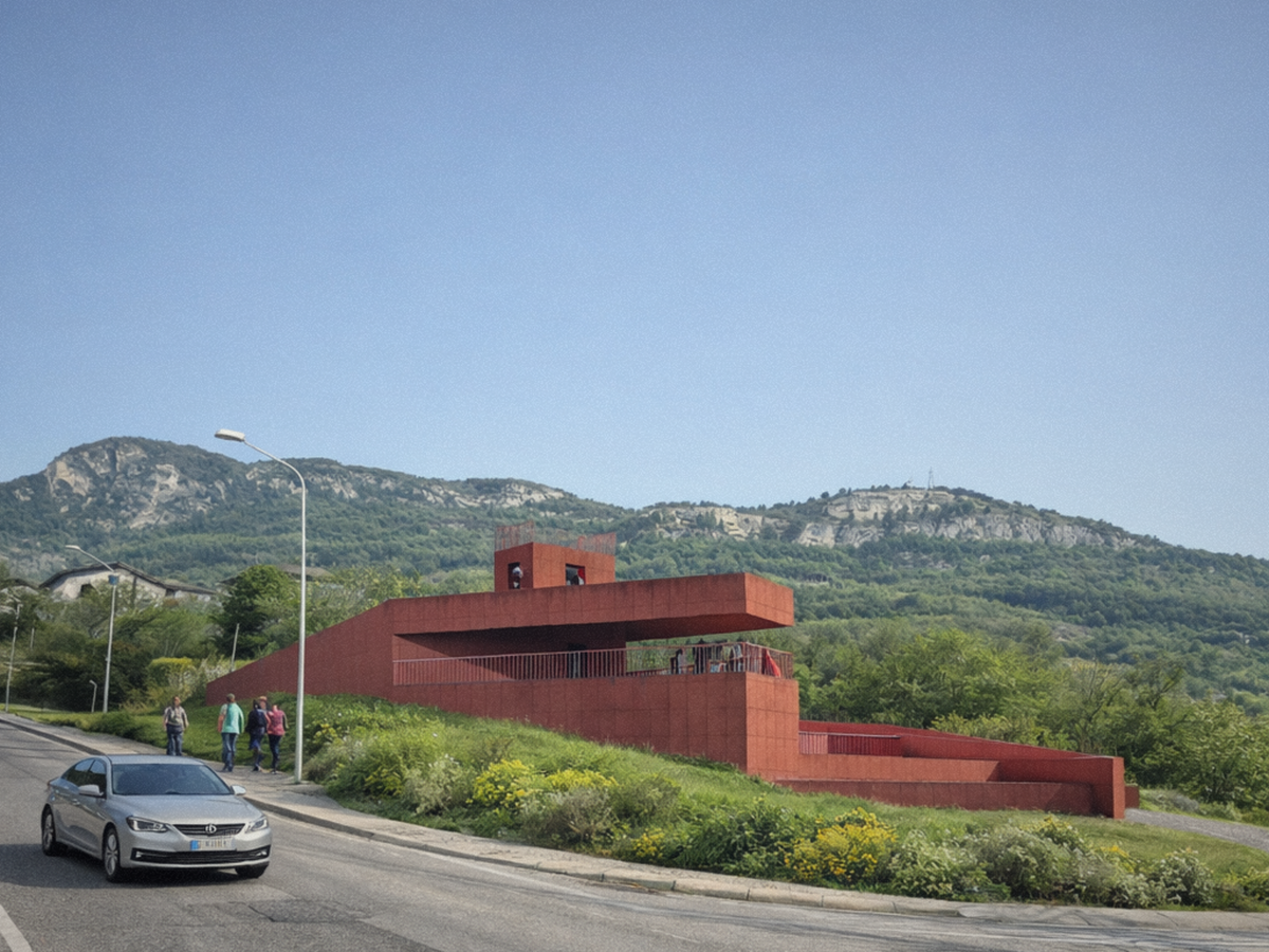 Il fabbricato è pensato in cemento armato colorato in pasta, tecnologia standard ma che consente l’effetto massivo di elemento che fuoriesce dal terreno e al tempo stesso materiale durevole e mutevole nella colorazione, nel tempo. Il guscio forte e ruvido e all’interno un’architettura circolare capace sia di essere costruita attraverso procedimenti a secco sia limitando l’energia grigia dell’intervento per reperibilità, gestione e smaltimento di materiali e maestranze. Gli interni sono pensati per essere realizzati con sistemi a secco in modo che l’edificio si possa riconfigurare con una certa versatilità a seconda dell’uso che se ne farà. La volumetria proposta rappresenta un elemento che influisce sulle prestazioni energetiche dell’edificio per compattezza, area coperta, studio dell’irraggiamento e delle schermature. La scelta consapevole dell’assenza di aperture verso l’esterno permette un consistente risparmio sulle superfici disperdenti, quindi con ricadute energetiche notevoli. L’accesso dei fruitori della caserma avviene da via Marmighe, con un piccolo tratto di strada bianca che porta all’area di parcheggio sulla parte alta del lotto. Nel progetto i posti sono limitati alla richiesta ma volendo potrebbe essere implementato di qualche altra unità. L’impatto è minimo per non stravolgere le superfici dei prati attuali che possono e debbono diventare parco pubblico fruibile a tutti.