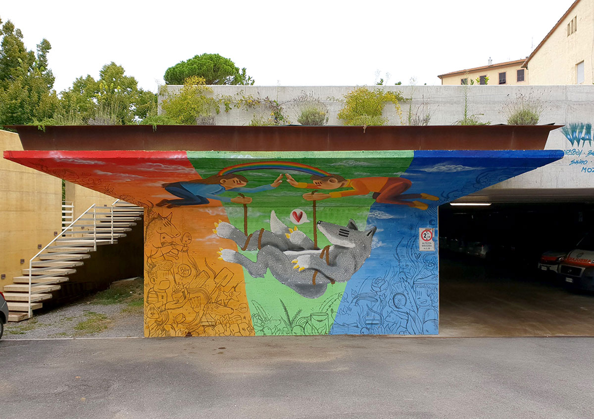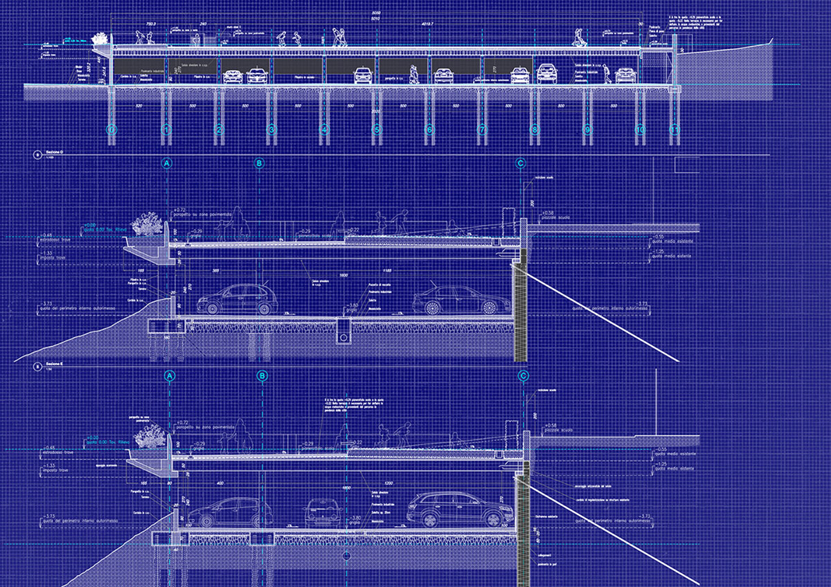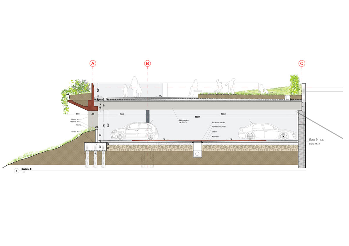 La copertura del parcheggio diventerà un grande spazio verde sopraelevato, collegato alla scuola e pensato per accogliere studenti, cittadini e visitatori.