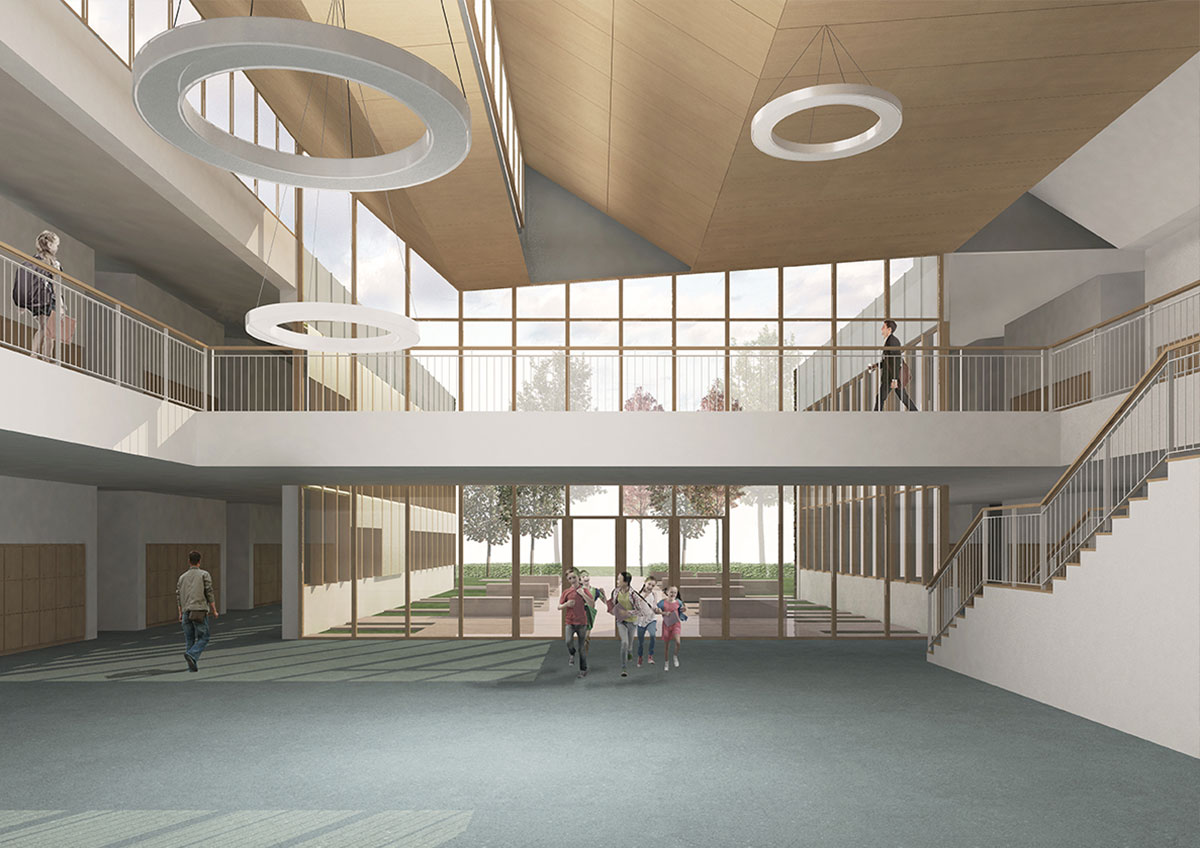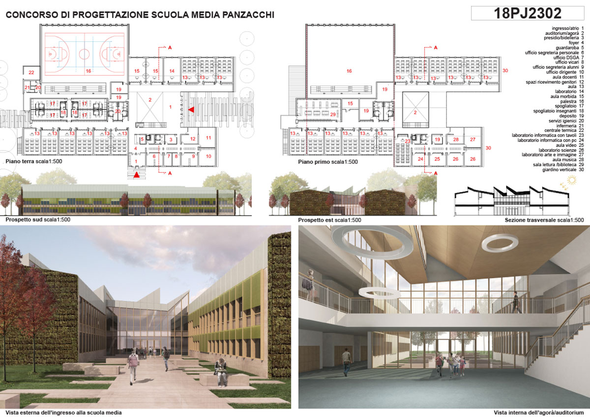 Questo ambiente definito come “Agorà”, luogo di relazione e di incontro, nel quale svolgere eventi comuni a tutto il complesso, può essere all’occorrenza allestito come auditorium per 250 posti. Gli spazi per la didattica e le attività di gruppo sono contenuti all’interno di due corpi allungati, orientati in direzione est-ovest, mentre la palestra, arretrata rispetto al fronte stradale, è posizionata sul sedime di quella esistente.