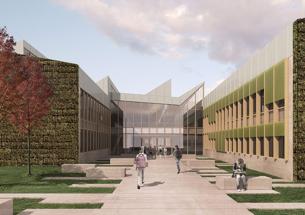 Nel volume che prospetta via 2 Giugno, in prossimità dell’ingresso “pubblico” sono pensate tutte le funzioni condivise con la città: l’ingresso all’auditorium, la biblioteca, i laboratori, gli uffici ed il ricevimento genitori.